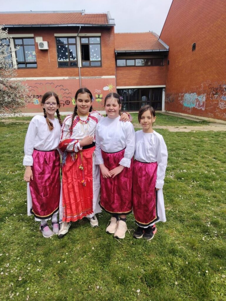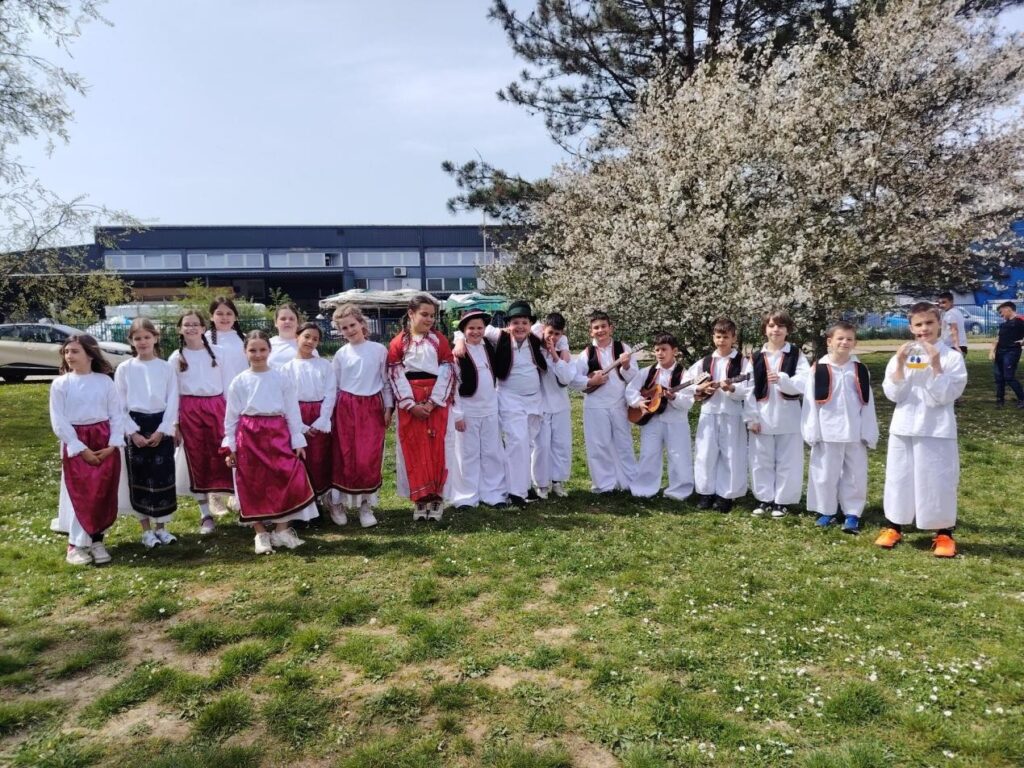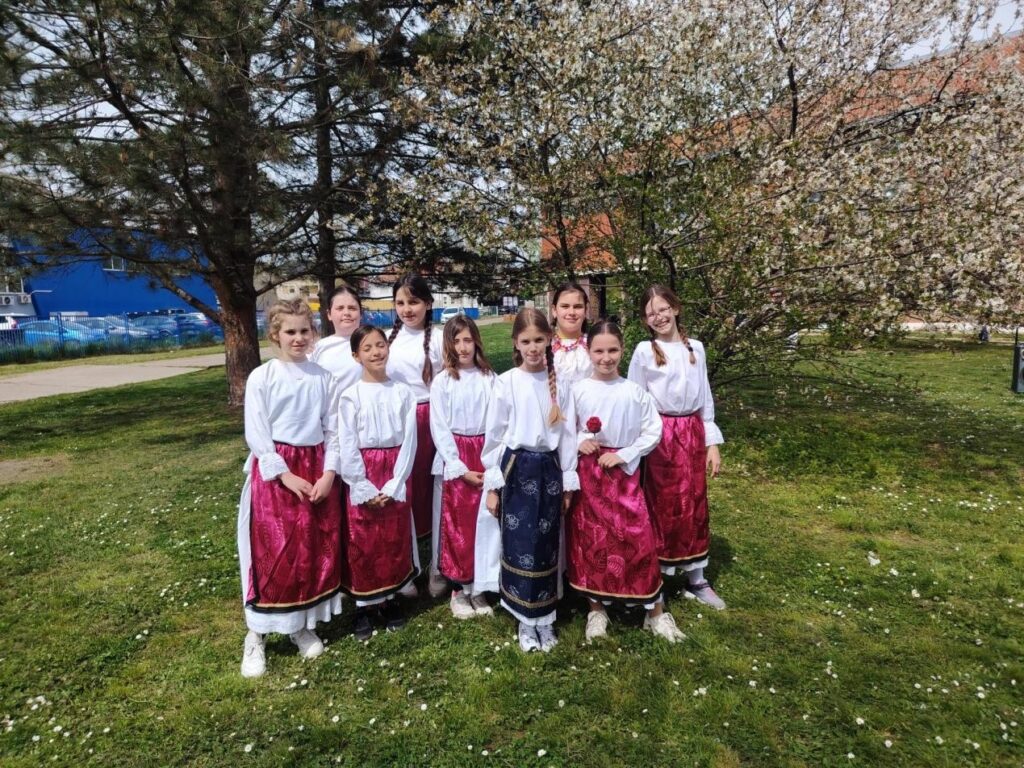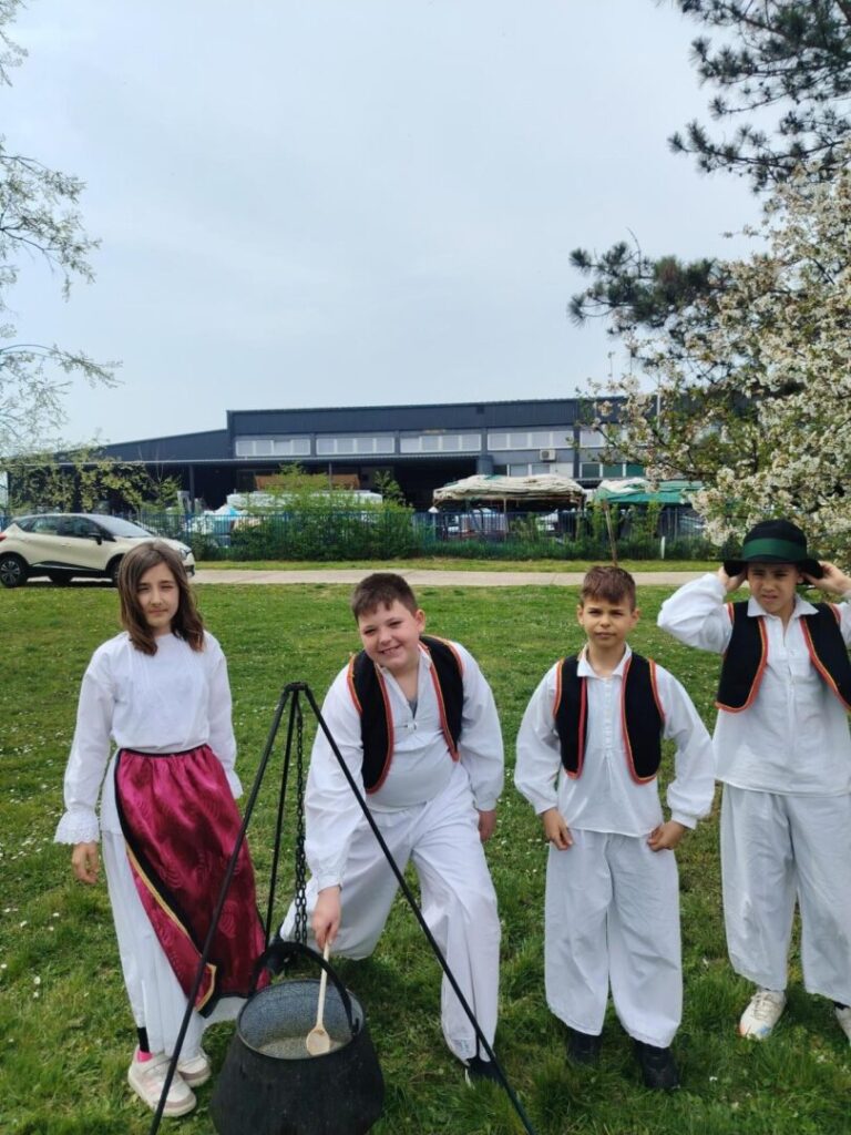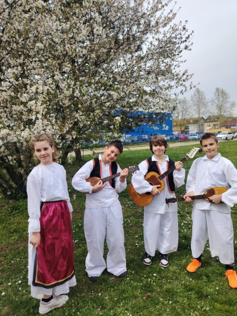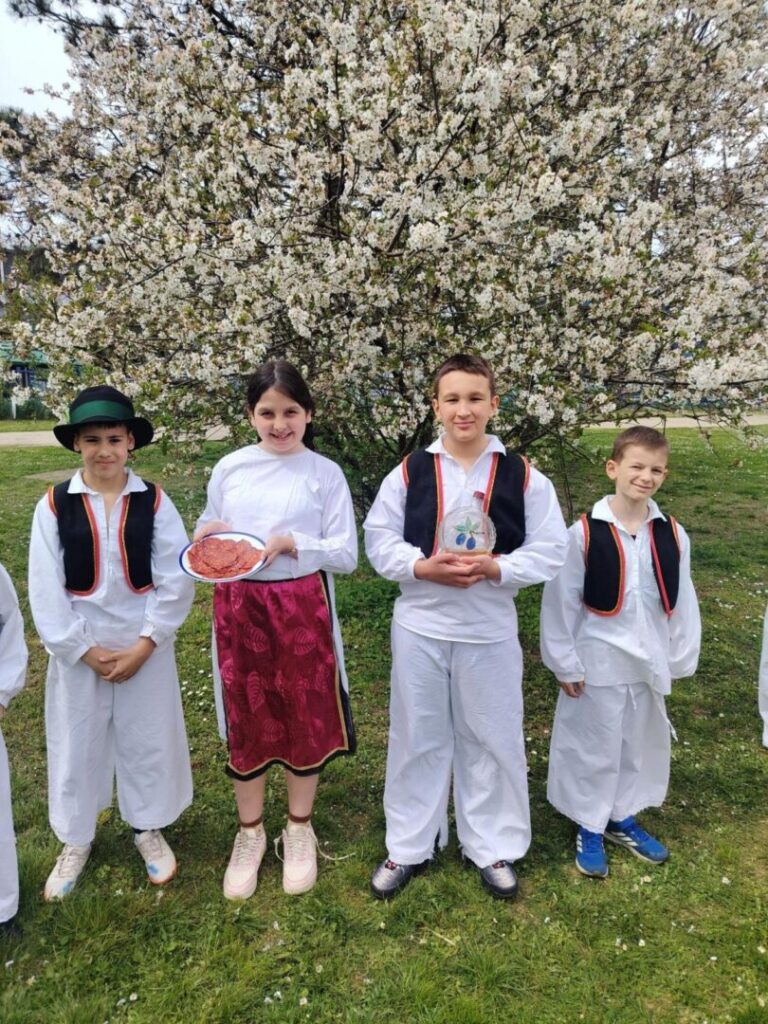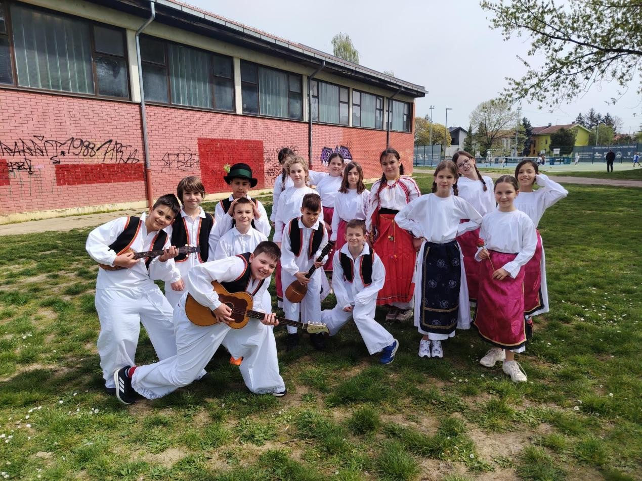 Obučeni u predivne narodne nošnje, uz rekvizite poput kotlića, tamburice finog kulena, donijeli su dio slavonske tradicije u dvorište naše škole.