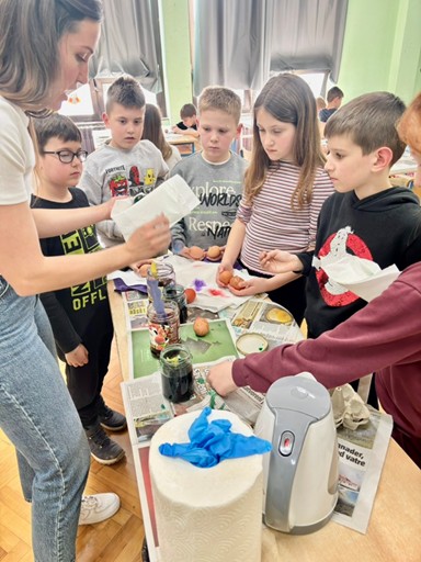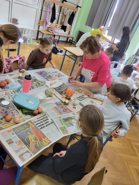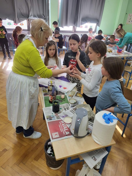 Radionicu su vodile gošće iz Šokačke grane te su učenicima demonstrirale tradicionalni slavonski običaj ukrašavanja uskrsnih pisanica.